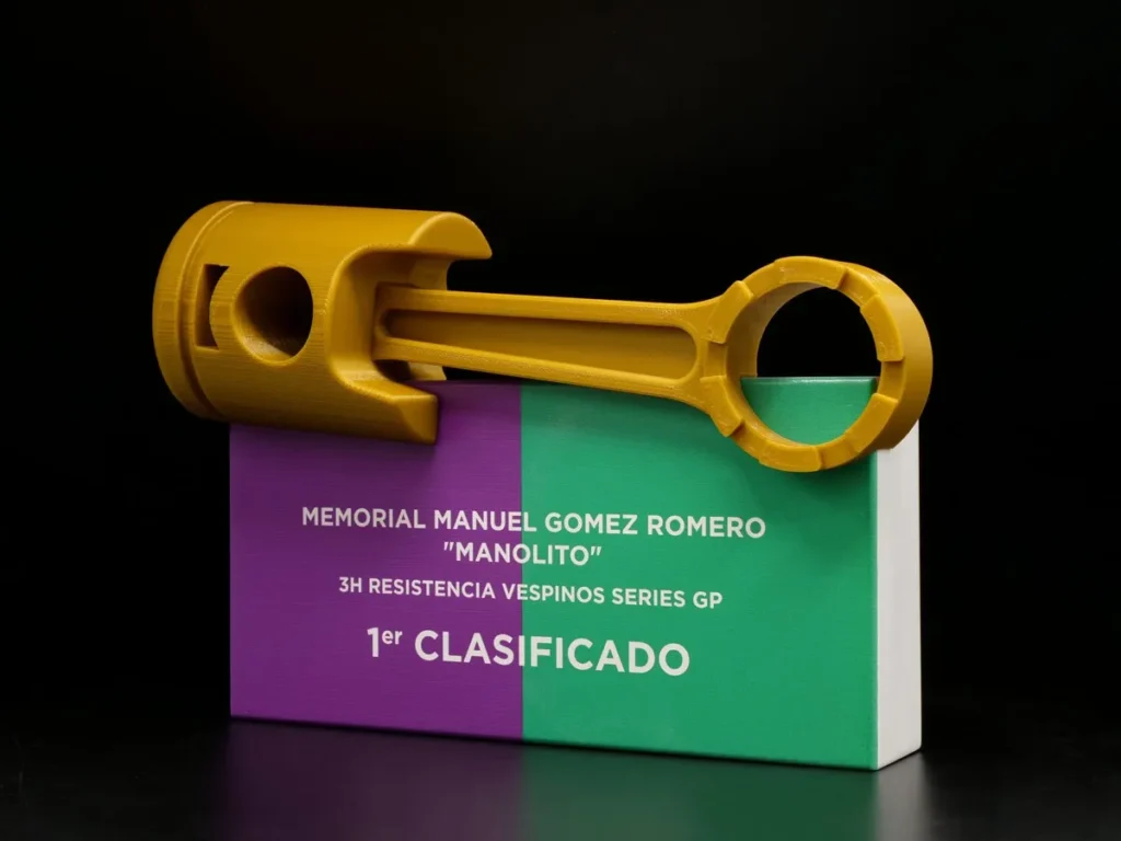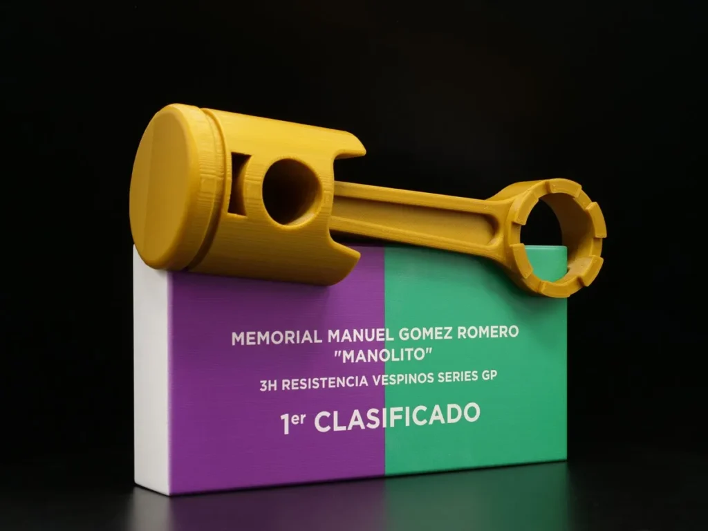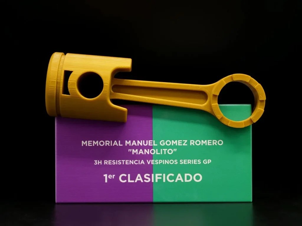 La tecnología de impresión 3D nos permitió dar forma al trofeo de motos 1º Clasificado 3h Resistencia Vespinos Series GP, un trofeo personalizado y exclusivo que sólo puedes encontrar en Mi Pequeña Fabrica.