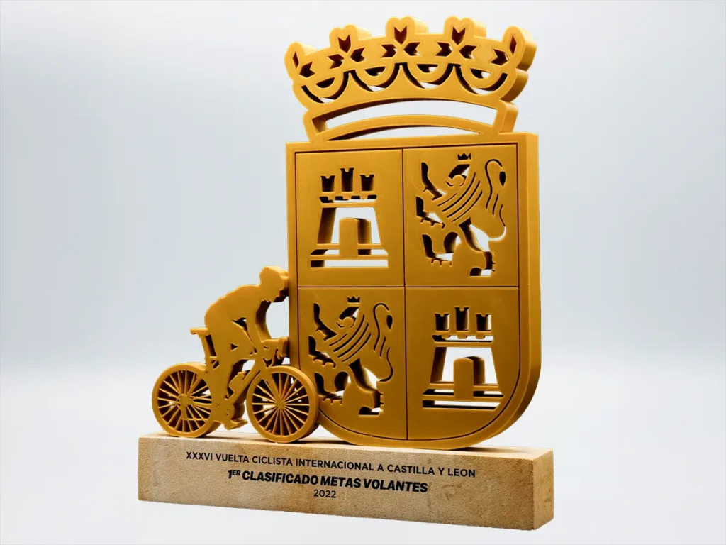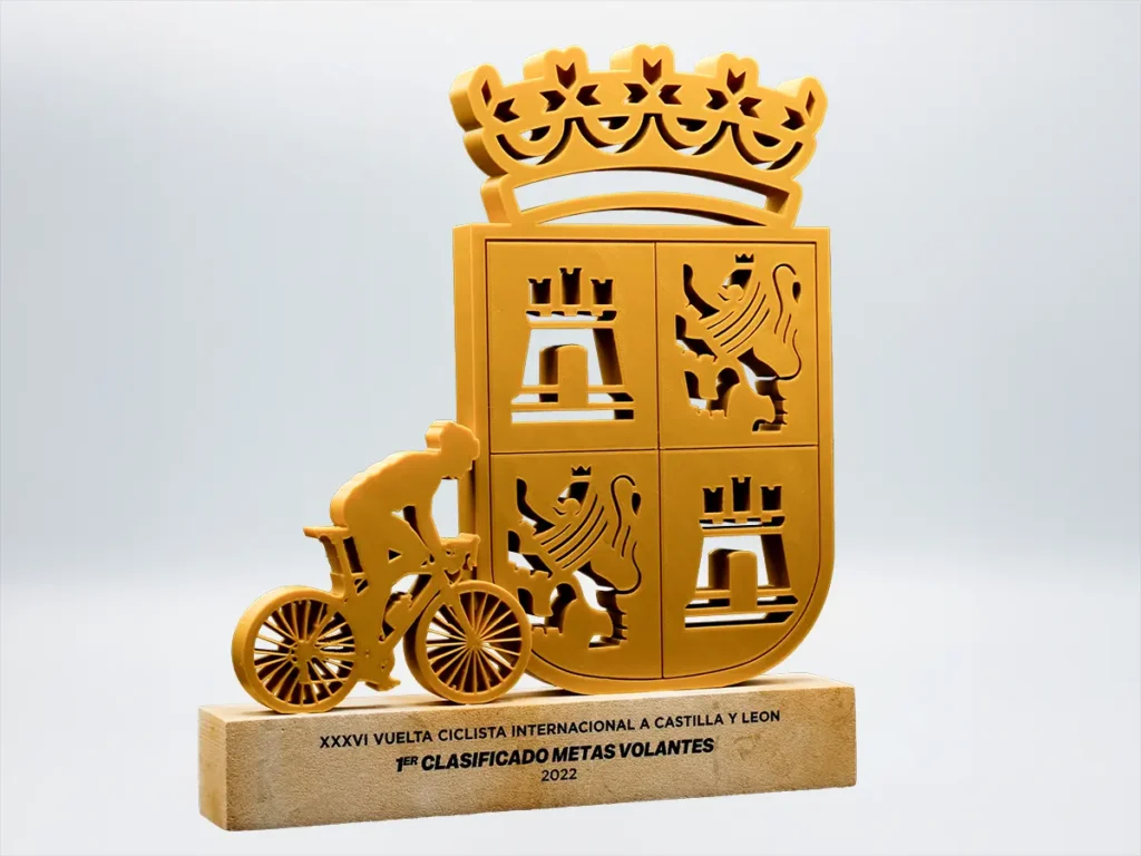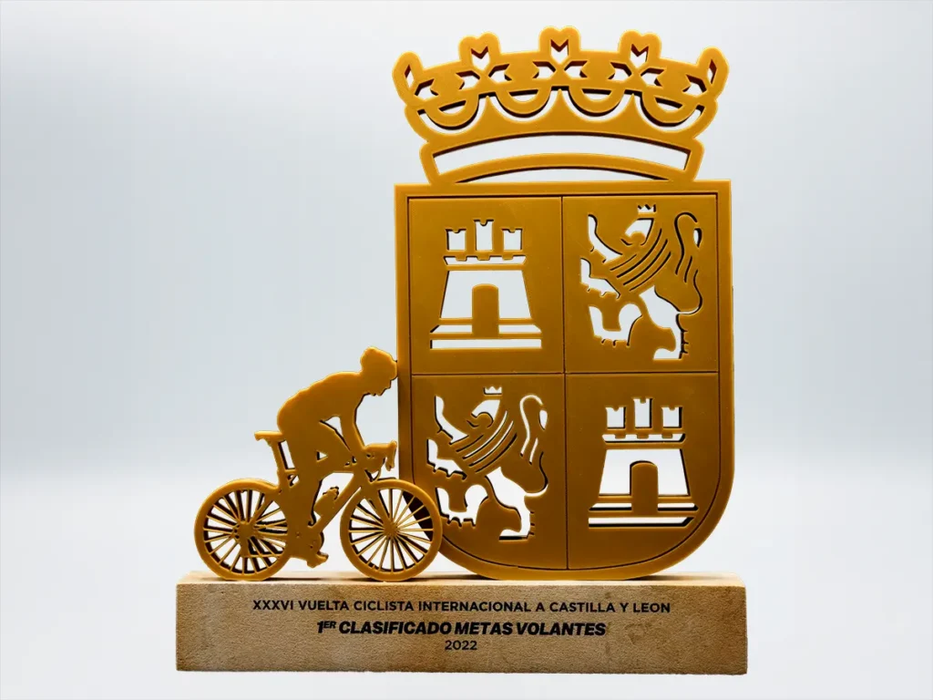 En Mi Pequeña Fábrica estamos comprometidos con la innovación y la creatividad en cada uno de nuestros trofeos de ciclismo, y nuestro trofeo personalizado 1º Clasificado Metas Volantes XXXVI Vuelta Ciclista Internacional a Castilla y León es un ejemplo perfecto de esto.