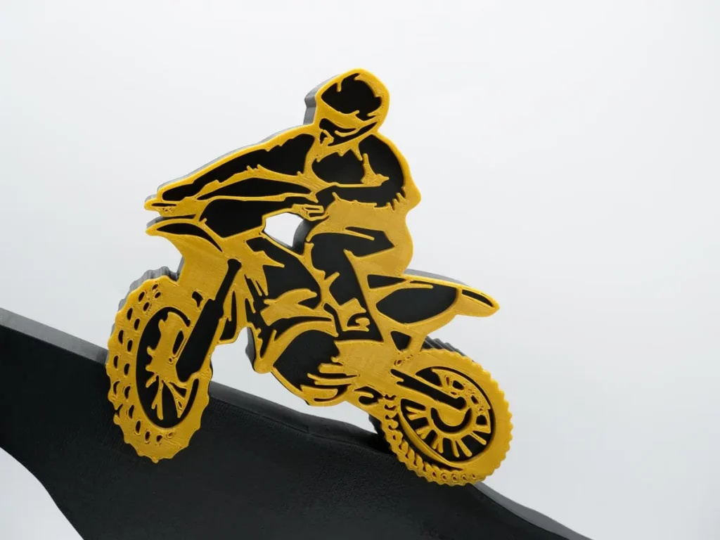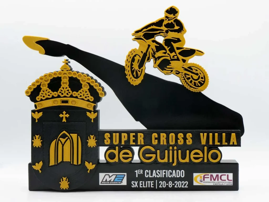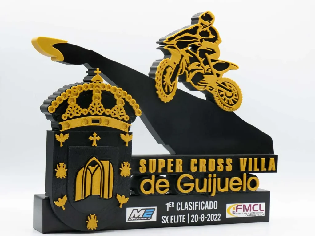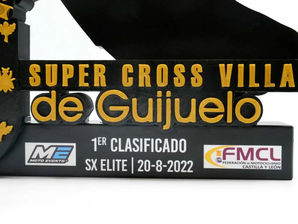 El trofeo personalizado 1º Clasificado SX Élite Super Cross Villa de Guijuelo 2022 diseñado y creado por Mi Pequeña Fábrica con impresión 3D es un ejemplo de nuestra innovación y creatividad.