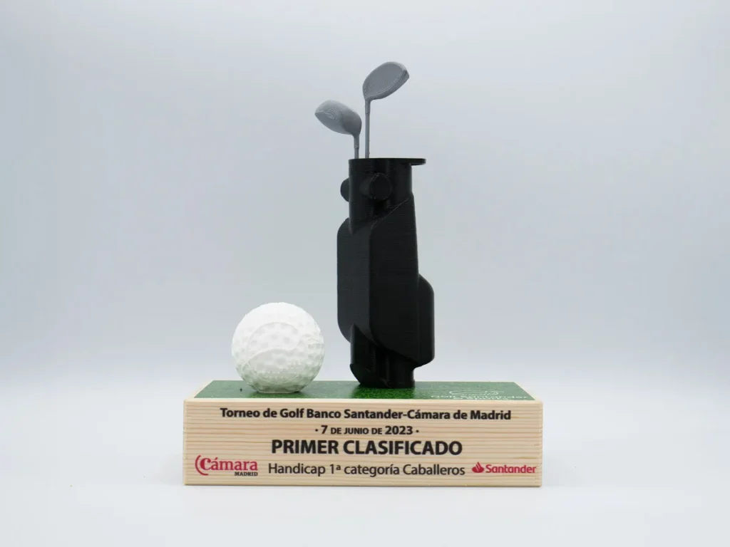En Mi Pequeña Fábrica, nos especializamos en la creación de trofeos personalizados en 3D, y estamos encantados de presentarte nuestro trofeo personalizado «Primer Clasificado Caballeros Torneo de Golf Banco Santander«. Este trofeo es perfecto para premiar al ganador del prestigioso Torneo de Golf Banco Santander, que se celebró en Madrid.