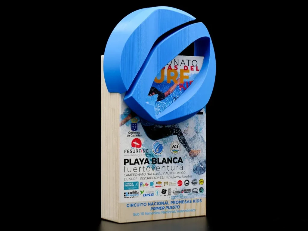 El trofeo personalizado Primer Puesto Circuito Nacional Promesas Kids Surf Playa Blanca Fuerteventura es una pieza única y personalizada, creada con la tecnología de impresión 3D más avanzada y los materiales de mayor calidad.