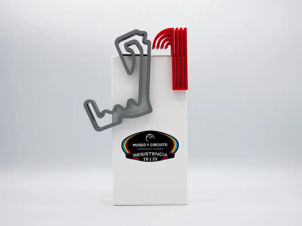 El Trofeo Primer Puesto Resistencia 2023 Museo y Circuito Fernando Alonso ha sido especialmente diseñado para el evento Circuito Resistencia 2023, que se llevará a cabo en el impresionante Museo y Circuito Fernando Alonso, ubicado en Cayés, Asturias. Este trofeo representa la excelencia y el esfuerzo de los participantes, y será entregado al ganador del evento. Con un diseño único y detallado, este trofeo captura la esencia de la competición y la pasión por el deporte.