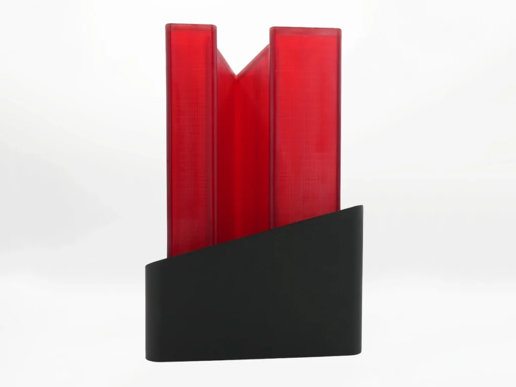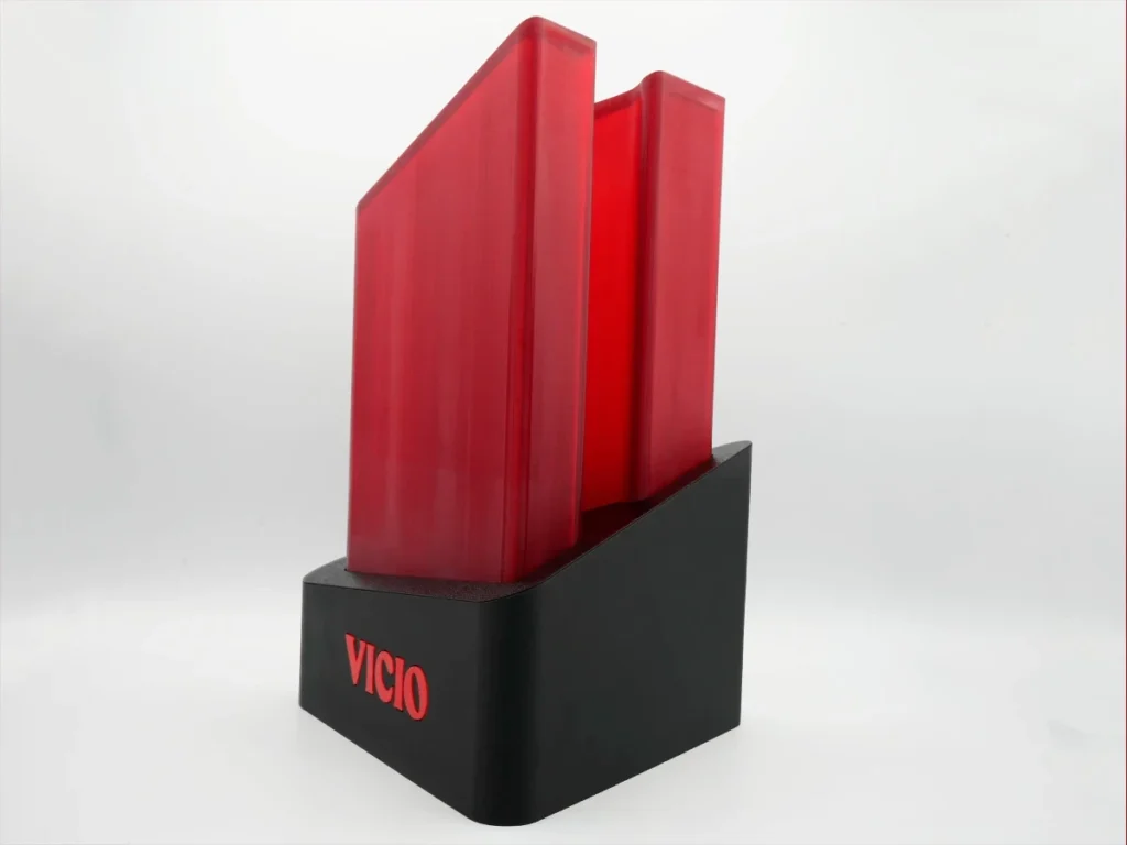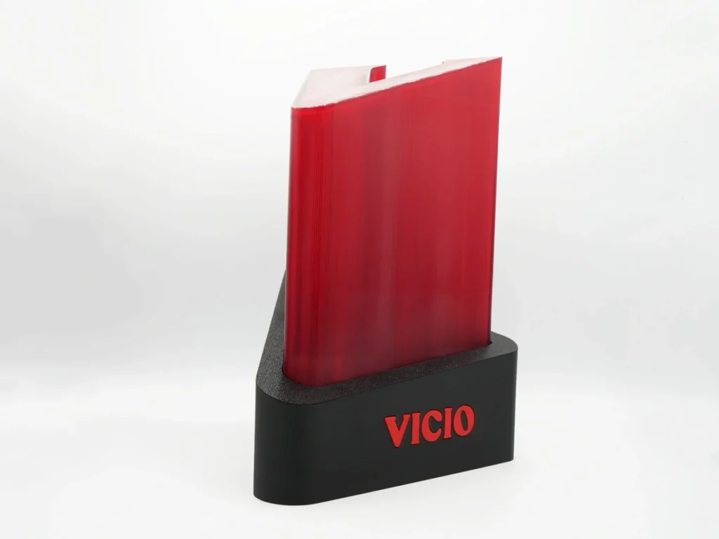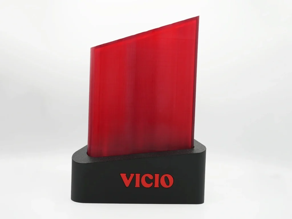 El trofeo personalizado para VICIO es una pieza única de diseño vanguardista, creada para representar la esencia innovadora y disruptiva de la marca. Fabricado en resina de alta calidad, destaca por su estructura moderna y su acabado translúcido en un tono rojo característico de la marca.