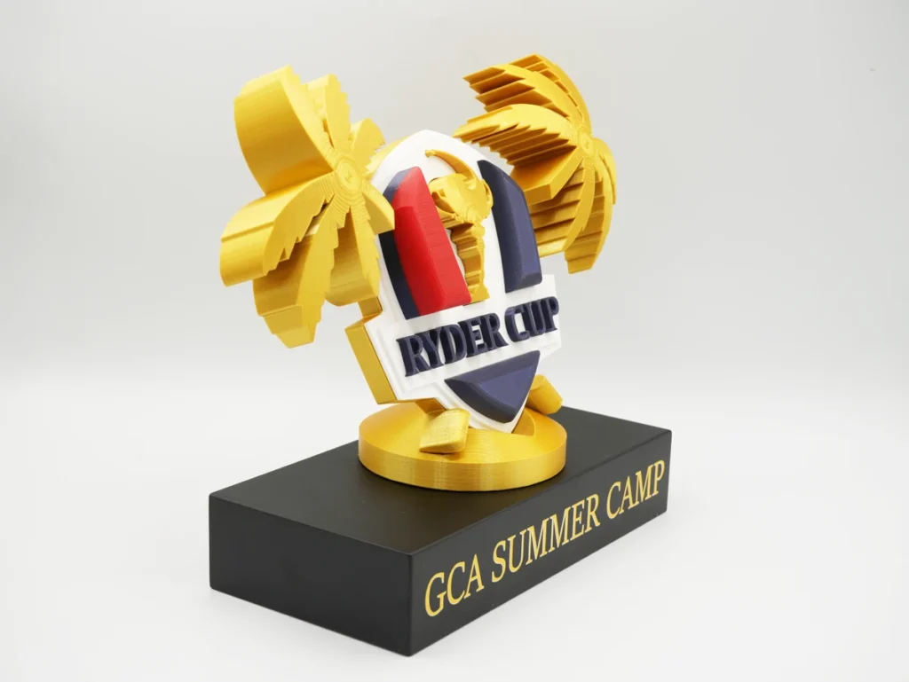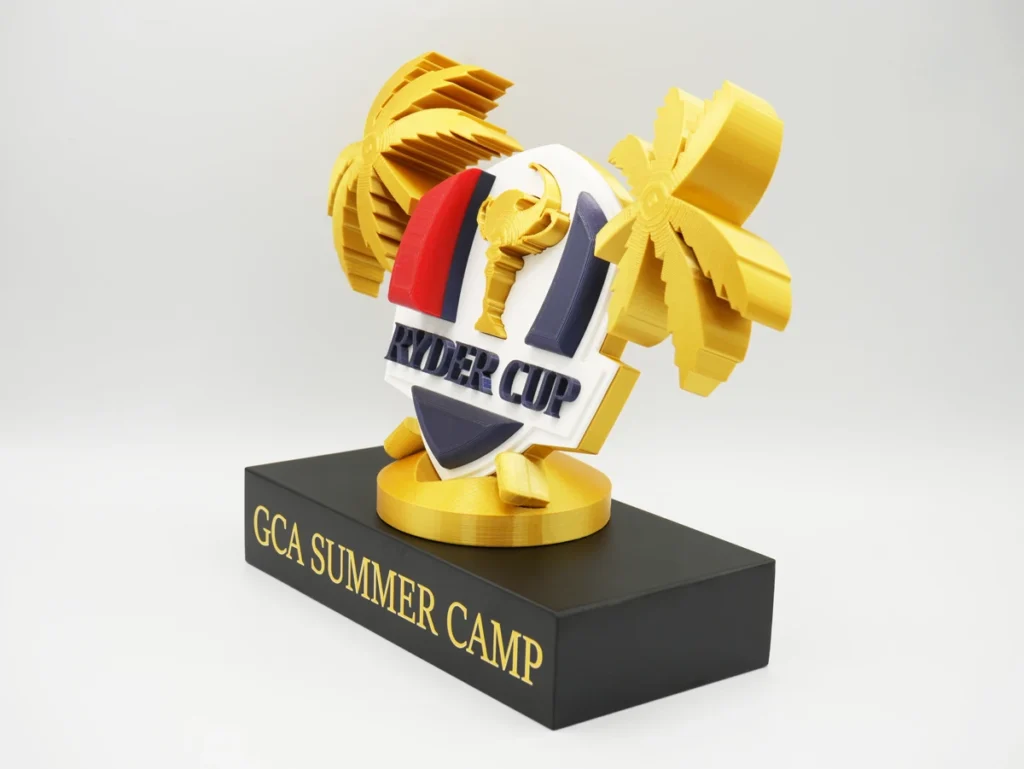 En Mi Pequeña Fábrica, sabemos que cada trofeo debe capturar la esencia del evento al que representa. Para la GCA Summer Camp – Ryder Cup, diseñamos un trofeo único utilizando impresión 3D, combinando el logo de Ryder Cup en PLA con dos palmeras rodeándolo, todo sobre una elegante peana negra.